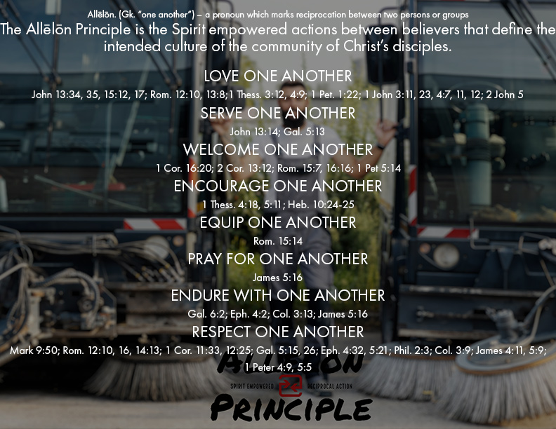 Now they say that “a picture is worth a thousand words,” and so the mental picture that we use when trying to remember the categories for the Allēlōn Principle is that of a street sweeper. We use this acrostic and visualize a street sweeper with the word “Love” painted on the side of it. We call it the “Love Sweeper.”